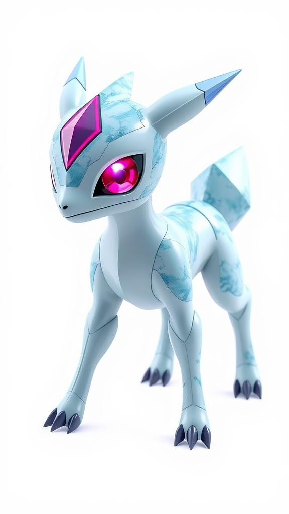 full_body, radiant_eyes, pokemon_theme, deep_ruby_eyes, minimal_background, solo_scene, pristine_white_background, slight_chromatic_effect, opulent_marble, majestic_light_blue_granite, four_legged, futuristic_design, sci_fi_inspired, stylized_3d_render, vibrant, sleek, unique_two_dimensional, no_low_quality_elements, clear_of_text_logos, free_of_watermarks, no_signatures, in_frame, no_jpeg_artifacts, aesthetically_pleasing, well_drawn, correct_anatomy, natural_body_positions, proportionate_limbs, harmonious_features, centered_composition, lifelike, sharp, realistic, balanced, clear, and well_defined.