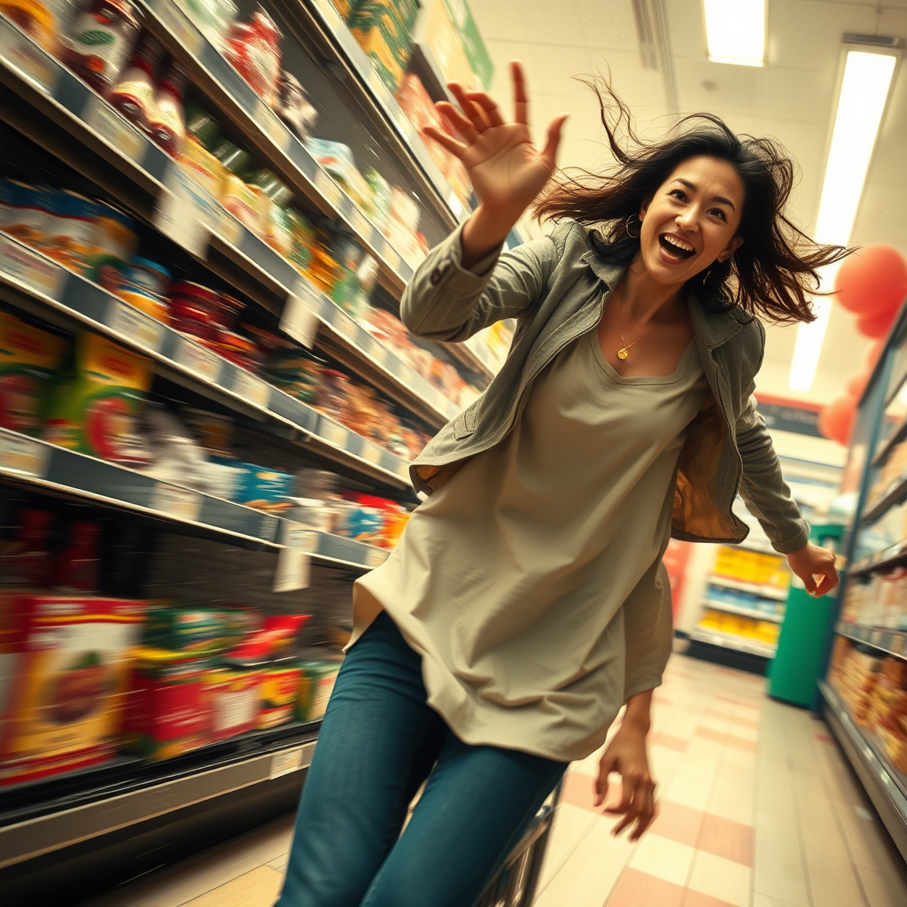 A woman dashes energetically through the supermarket aisle, with an air of playful chaos, her expression a delightful mix of surprise and determination. Set in a photo-realistic hyperbole reminiscent of Zhang Jingna's style, the scene bursts with vibrant energy and exaggerated features. Drawing inspiration from Yasuo Kuniyoshi, the composition-playfully distorts reality, capturing a moment of whirlwind activity. The low-angle perspective emphasizes the woman's dynamic movement, while hints of Jessica Drossin's atmospheric touch imbue the scene with a dreamlike quality, as everyday objects blur into a kaleidoscope of colors and textures.