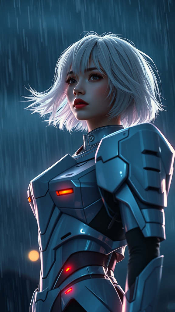 A young woman adorned in sleek Gundam-inspired armor, her short white hair flowing gently in the wind on a stormy night. She stands alone under the dark sky, illuminated by the glistening rain. The scene captures an essence revered on art platforms, with extreme attention to detail. The atmosphere is cinematic and divine, with a surreal, celestial touch reminiscent of manga and anime. Lens flares and glowing lights enhance the intricate colors, set in a high-resolution, hyperrealistic style. The environment is rendered with the precision of Unreal Engine 5, emphasizing its photorealistic and CGI qualities. This stunning masterpiece is evocative of 4K photography, combining the allure of cinematic lighting and Lumen reflections, capturing a vivid portrait without the disruption of common artistic flaws or distortions, ensuring proportions and details remain flawless and captivating.