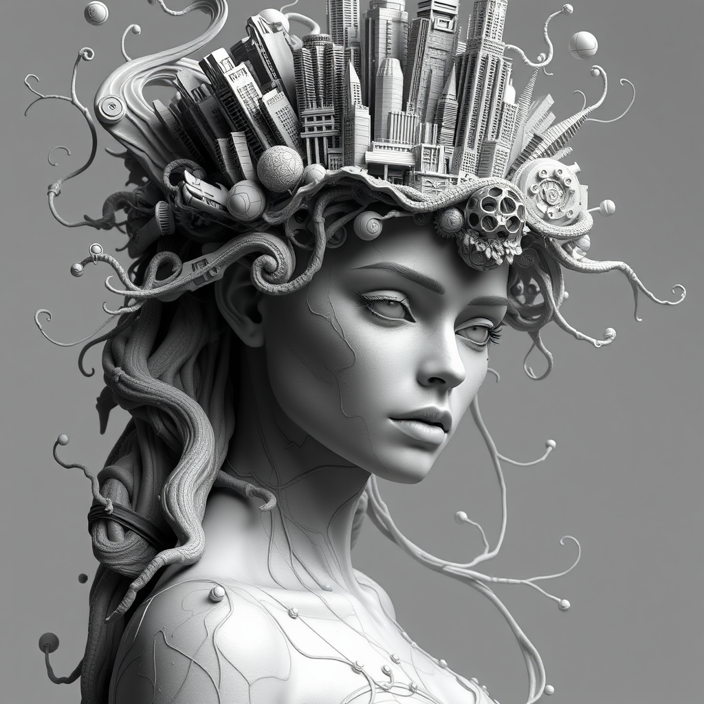 A hyper-realistic sci-fi sculpture of a woman in black and white, adorned with an intricate crown that resembles futuristic cityscapes, intricately detailed with depictions of swirling natural elements, created using Zbrush, capturing the juxtaposition of nature and technology with subtle artistic embellishments like delicate patterns etched into her skin and flowing, vine-like structures entwined around her form.