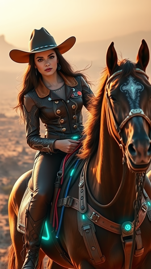 A stunningly beautiful space cowgirl sits confidently astride her horse, both adorned with a fusion of classic wild west and futuristic sci-fi elements. Her attire blends traditional cowgirl fashion with high-tech, featuring a wide-brimmed hat with glowing edges and a leather jacket woven with intricate electronic patterns. The horse, a sleek, powerful creature, wears a semi-transparent saddle with neon accents and subtle armor. In the background, a breathtaking alien landscape stretches far and wide, dotted with futuristic settlements and rugged terrain reminiscent of the old west. The scene is captured in ultra-detailed, realistic photography, with vivid colors and textures brought to life in 8k resolution, capturing every nuance of this unique space age era.