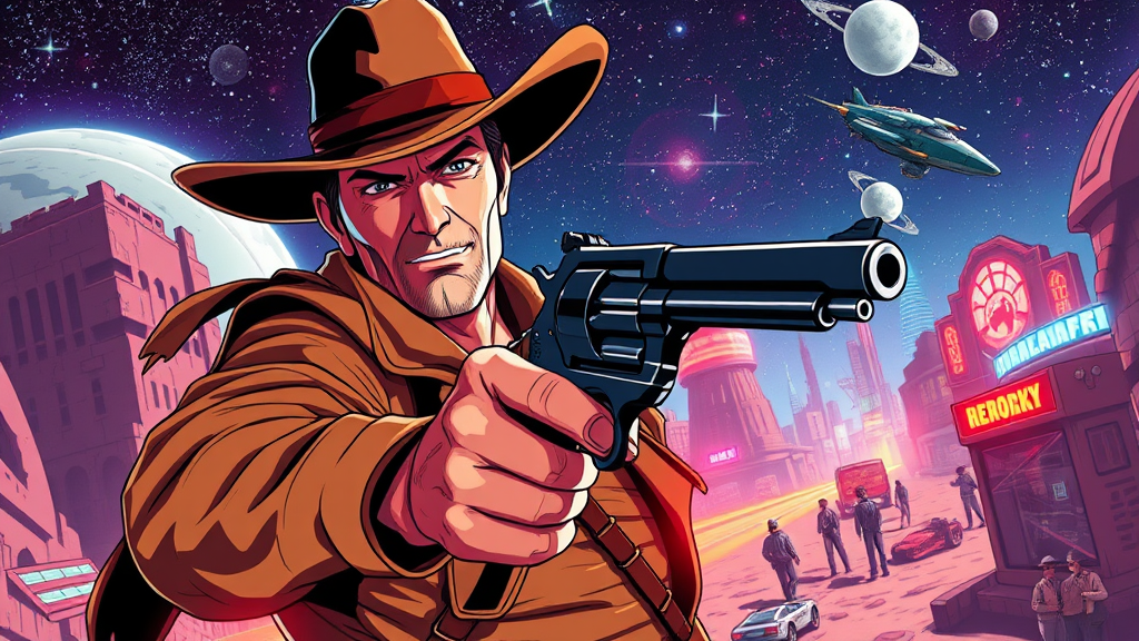 John Wayne as an intergalactic bounty hunter, fusing classic Western spirit with vibrant anime flair, set against the backdrop of a bustling space frontier. Picture a rugged, iconic hero clad in stylized futuristic cowboy attire, complete with a wide-brimmed hat and laser revolver. He navigates the vast, star-studded cosmos, patrolling dusty asteroid outposts and neon-lit spaceports. A storyline rich with adventure unfolds as he encounters eccentric alien characters, duels in zero-gravity shootouts, and searches for a lost relic amidst the lawlessness of the galaxy. The scene embodies a blend of Western grit and sci-fi wonder, with dynamic action and cinematic visuals inspired by the likes of Cowboy Bebop and Trigun.