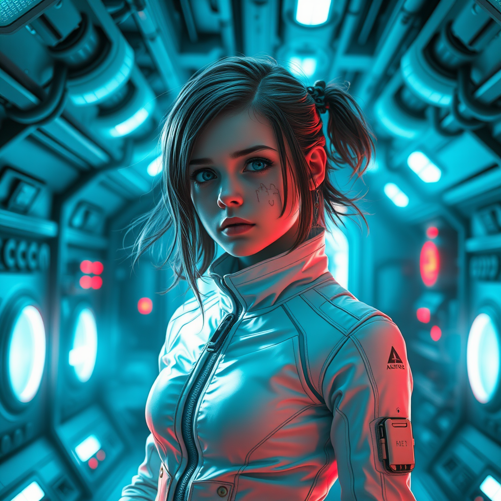 Young girl in a sleek, white sci-fi jumpsuit, with cyberpunk flair, sporting styled hair, inside a futuristic spaceship's cold and gloomy room. Her expression is icy, and her hair flutters slightly from the spaceship's ventilation. The room is filled with intricate graphics and muted colors, dominated by blue and bright lumens casting sharp shadows. The scene is characterized by its hyper-detailed, multi-storey space with sharp angles, blurred backgrounds, and sci-fi elements. Energy clumps and flashes of light add a dynamic feel, captured in a third-person, portrait-style view. Circular illuminations and elements give a sense of surrealism. Red accents and minor mutations can be seen, like deformed and disfigured anatomy—a double face, extra limbs, and totem-like features, adding a disquieting twist. Disfigured proportions and ghostly, cloudy eyes accentuate the lifeless expression, juxtaposed against blinding light, amidst a futuristic and hyper-detailed world.