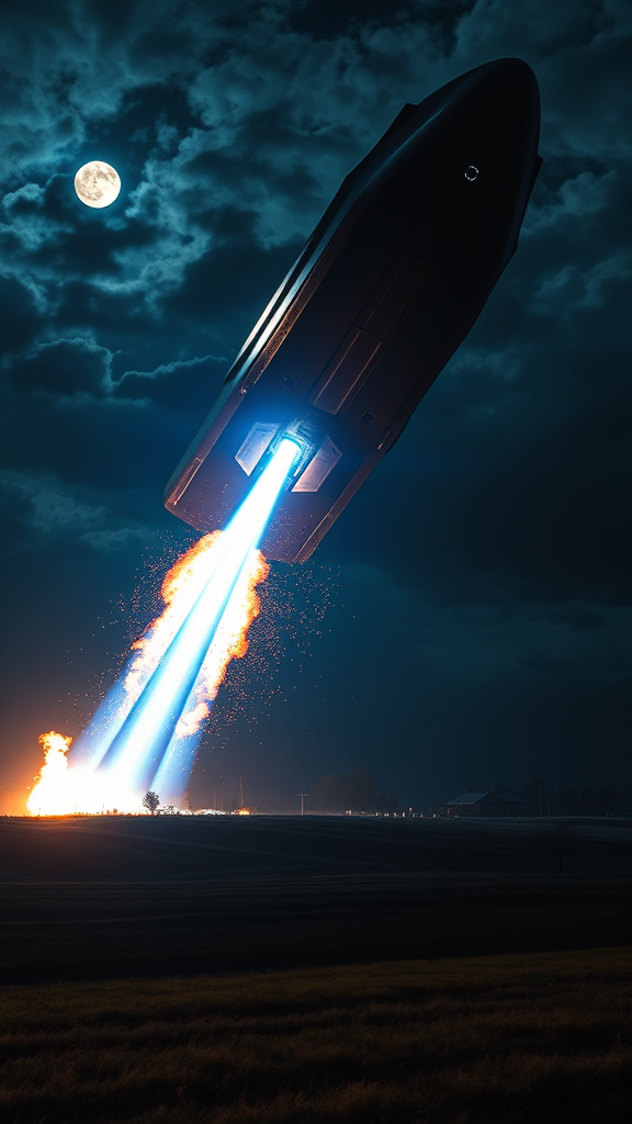 Under the dark, cloudy night sky, a colossal spaceship looms ominously over an isolated farm, its sleek metallic surface shimmering in the moonlight. Suddenly, a brilliant blue beam erupts from the ship, focused and furious, incinerating the fields below in an awe-inspiring display of power. Flames roar to life, sending showers of debris spiraling into the air, reflecting fiery hues across the vibrating countryside. Shadows dance across the landscape as the ground trembles under the force of the blast, the scene captured in breathtaking, cinematic detail. The ship's enigmatic presence dominates the horizon, a testament to otherworldly dominance in a sci-fi spectacle of destruction.