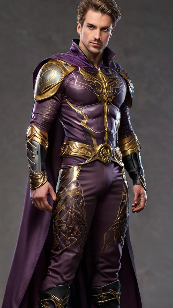 Hypermasculine Caucasian white male. A prince, royal. Futuristic, Sci-Fi, super-hero. Tall, muscular, fit, sinewy, broad chest, broad shoulders, narrow waist, strong muscular legs. Aubergine hair, short wavy bob hairstyle, middle part with Bangs falling over his eyes. Strong brow and jaw, handsome face. Light brown sandy colored eyes, soulful and intense. Aubergine colored Beard. Full Beard, close to face and neatly trimmed. Long sleeved spandex shirt with mesh cut-outs. Shirt is purple with metallic gold accents and tech patterns. A black leather single strap harness with a gold o-ring and gold buckles strapped across his chest. Purple metal shoulder pads with glowing yellow glyphs. Form-fitting spandex pants, purple with gold tech patterns and accents down the sides of the legs. Black tech belt with a glowing amethyst jewel at the center around his waist. Black metallic bracers on his arms. Metallic black boots with gold accents, knee high tall boots. A short purple oval shaped cape with a golden shooting star graphic down the middle of it. Cape is split down the middle to resemble wings. He carries a metallic gold staff with a glowing purple light at the end, signifying his royal authority and tech powers. Full body pose, fighting stance.