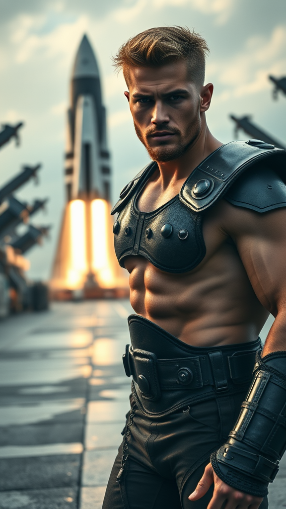 Ultrarealistic full-length photograph featuring a 28-year-old Israeli Caucasian male with an impressive athletic build, exuding confidence and strength. His well-defined physique is complemented by a hairy chest and bright, shiny hair. Captured in a wide field of view, the cinematic scene unfolds at a futuristic spaceport, where a sci-fi ship is about to lift off in the backdrop. The moody, natural lighting casts dramatic shadows on his leather plate armor, highlighting the intricate details and textures akin to the 'pursuit' by Gesaffelstein. The hyper-realistic image, shot in 8K Ultra-HD, employs a combination of blur effects and long exposure for a dynamic and epic atmosphere. The natural and volumetric lighting enhances the sci-fi setting, while the action pose of the male model contributes to the overall photorealism and vibrancy. With an emphasis on high detail and cinematic rendering, this scene brings together elements of photography and imaginative storytelling in a breathtaking portrayal.