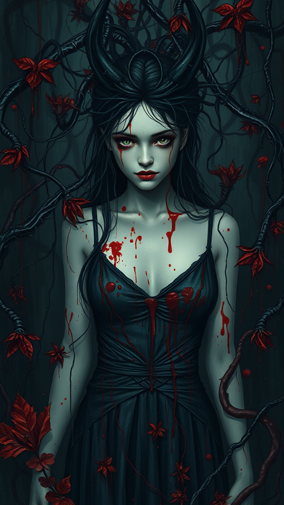 A mysterious girl in a high-cut dress is enveloped by a network of dark, web-like veins, her skin shimmering as if coated in dripping oil. Sinister, predatory plants with thorny tendrils creep around her feet, intertwined with strands of ivy. Her face is a pale canvas that stands out against the gloaming scene, with intense red splashes and subtle red smudges subtly highlighting her features. The entire backdrop is a cascade of viscous, inky oil, creating a surreal depth. This vivid illustration is rendered in fine art style, utilizing 8K resolution and dramatic rim and artificial lighting to impart a cinematic quality to the composition.