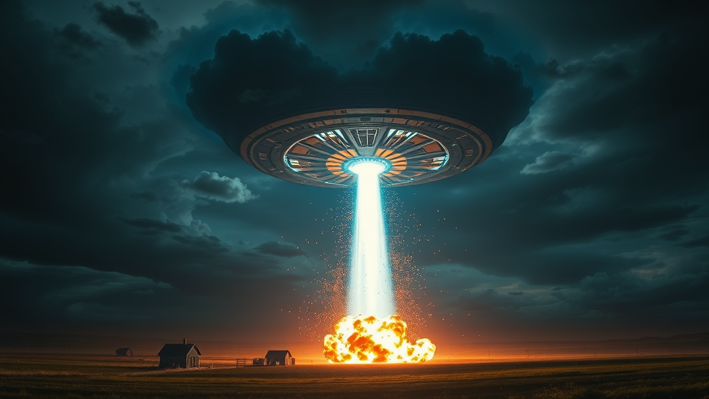 In the dead of night, under a shrouded sky thick with dark, swirling clouds, a massive spaceship looms ominously above a tranquil farm. The colossal craft releases a pulsating, radiant blue beam that strikes the earth with cataclysmic force. The farm erupts in a spectacular explosion, debris cascading through the air like shooting stars. The night is transformed into day as brilliant flames cast flickering shadows across the landscape. Ringing with the sound of crackling fire and the echo of destruction, the scene is a breathtaking tableau of sci-fi intensity, painted with strokes of realism and cinematic flair.