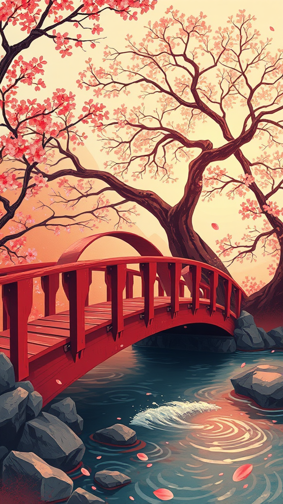 A traditional Japanese art style illustration depicts a weathered red wooden bridge arching gracefully over a winding stream. The scene is bathed in the warm, ethereal glow of the golden hour, with sunlight filtering through an abstract arrangement of stylized, swirling trees. Soft amber and crimson hues reflect off the water, infusing the image with a blend of nostalgia and contemporary vibrancy. Delicate cherry blossom petals drift through the air, adding a touch of whimsy, while gentle ripples in the stream mirror the serene, timeless beauty of nature in perfect harmony.