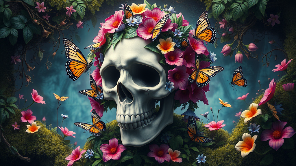 A highly detailed digital painting featuring a skull adorned with vibrant flowers and delicate butterflies, surrounded by lush vines, moss, and an abundance of background flora. Inspired by the psychedelic and poster art style of Chris LaBrooy, this piece is a masterpiece in digital art, with glow effects and hand-drawn elements rendered in an ultra-realistic, cinematic 8k quality using tools like Cinema 4D and Blender. The setting is dark and atmospheric, with sharp focus and a hint of humor. The intricate, high-detail composition combines the artistic influences of Ed Blinkey, Atey Ghailan, Jeremy Mann, Greg Manchess, and Antonio Moro, capturing the essence of trending art on platforms like ArtStation and CGSociety. The vivid colors and dramatic photorealistic style evoke a sense of wonder and imagination, showcasing a hyperrealistic model in a surreal yet natural environment.