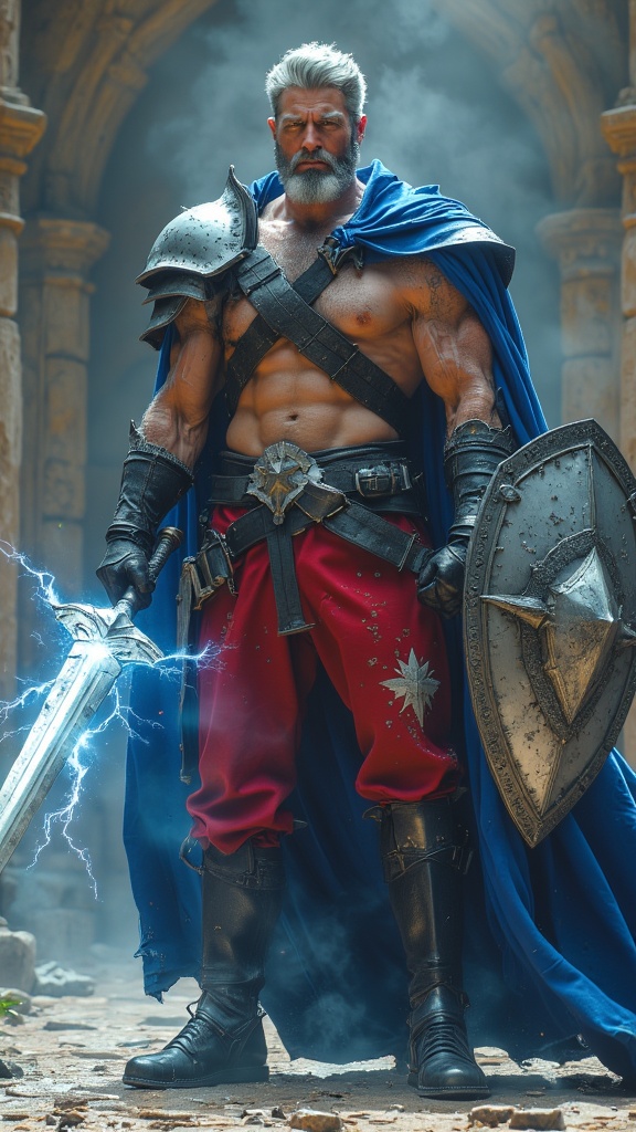 The American Revolution meets futuristic Sci-Fi. Hypermasculine, Caucasian male. Blacksmith, sword fighter. Tall, muscular, sinewy, strong, broad chest, wide shoulders and back, narrow waist. Handsome rugged face, strong brow and jaw, strong chin. Lapis blue eyes with thick silver eyebrows. Silver goatee on face, well trimmed. Medium length silver hair, wavy pompadour cut short on sides and back, tousled on top. Eight-pointed black star tattoo over the left eye. Black leather harness across his bare muscular chest, buckled on the right side. Large silver metal pauldrons and shoulder pads on both shoulders. Scarlet red tights/pants with white shooting star symbols down the sides of his thighs, stretched over muscular legs and a bulging groin. Black leather bucket boots, turned down at the knees. Black leather gloves, turned down at the elbows. A wide silver tech belt with black accents around his waist, meeting at a v-shape above his crotch. A short royal blue cape with a white shooting-star symbol, split down the back to resemble wings. He wields a huge silver electrified techno shortsword, electric voltage emitting from the blade. He also carries a techno shield, transparent and also electrified. full body pose.