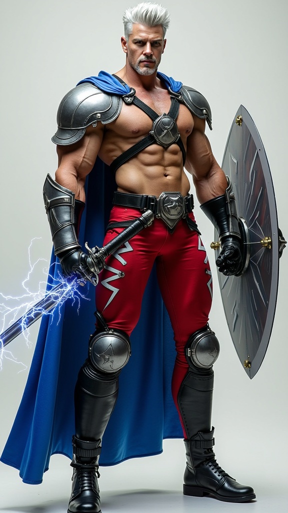 The American Revolution meets futuristic Sci-Fi. Hypermasculine, Caucasian male. Blacksmith, sword fighter. Tall, muscular, sinewy, strong, broad chest, wide shoulders and back, narrow waist. Handsome rugged face, strong brow and jaw, strong chin. Lapis blue eyes with thick silver eyebrows. Silver goatee on face, well trimmed. Medium length silver hair, wavy pompadour cut short on sides and back, tousled on top. Eight-pointed black star tattoo over the left eye. Black leather harness across his bare muscular chest, buckled on the right side. Large silver metal pauldrons and shoulder pads on both shoulders. Scarlet red tights/pants with white shooting star symbols down the sides of his thighs, stretched over muscular legs and a bulging groin. Black leather bucket boots, turned down at the knees. Black leather gloves, turned down at the elbows. A wide silver tech belt with black accents around his waist, meeting at a v-shape above his crotch. A short royal blue cape with a white shooting-star symbol, split down the back to resemble wings. He wields a huge silver electrified techno shortsword, electric voltage emitting from the blade. He also carries a techno shield, transparent and also electrified. full body pose.