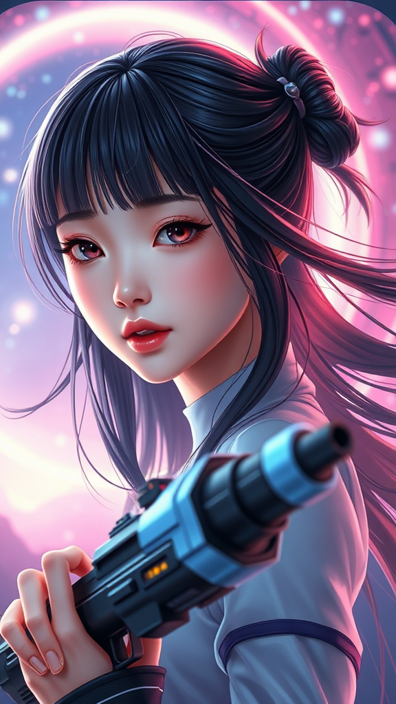 BREAK, 1girl, solo, looking at viewer, flat bangs, 3d face, beautiful girl, beautiful face, pretty, girlface, kpop idol, supermodel, stunning innocent symmetry face, perfect body, medium breast, slim waist, slim legs, glowing eyes, goddess, natural skin texture, radiant skin, fair skin, exquisitely detailed face, delicate features, refined face, golden ratio, harmonious face, expressive eyes, flawless complexion, clear visage, glossy hair, pale skin, accurate body proportion, ideal anatomy, realistic skin texture, silky lips, lustrous lips, subtle makeup, bright pupils, elegant figure, intricate eyes, defined pupils, highly detailed face and eyes, long eyelashes, gentle blush, graceful hands, captivating face, alluring female form, impeccably detailed skin, subtly glowing skin, BREAK, science fiction, flowing hair, holding weapon, adventurous expression, cosmic horizon, vibrant refraction, wormhole realm, futuristic skyline, cybernetic ambiance, mechanical, intensely metallic texture, vibrant neon lights, gust, chiaroscuro lighting, space distortion, mist, pixel art