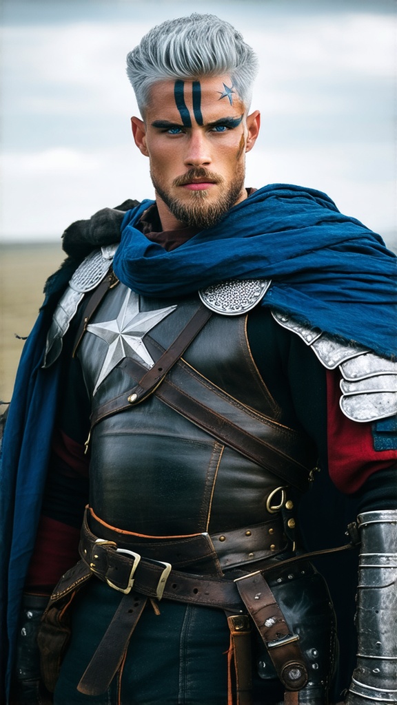 The American Revolution meets futuristic Sci-Fi. Hypermasculine, Caucasian male. Blacksmith, sword fighter. Tall, muscular, sinewy, strong, broad chest, wide shoulders and back, narrow waist. Handsome rugged face, strong brow and jaw, strong chin. Lapis blue eyes with thick silver eyebrows. Silver goatee on face, well trimmed. Medium length silver hair, wavy pompadour cut short on sides and back, tousled on top. Eight-pointed black star tattoo over the left eye. Black leather harness across his bare muscular chest, buckled on the right side. Large silver metal pauldrons and shoulder pads on both shoulders. Scarlet red tights/pants with white shooting star symbols down the sides of his thighs, stretched over muscular legs and a bulging groin. Black leather bucket boots, turned down at the knees. Black leather gloves, turned down at the elbows. A wide silver tech belt with black accents around his waist, meeting at a v-shape above his crotch. A short royal blue cape with a white shooting-star symbol, split down the back to resemble wings. He wields a huge silver electrified techno shortsword, electric voltage emitting from the blade. He also carries a techno shield, transparent and also electrified. full body pose.