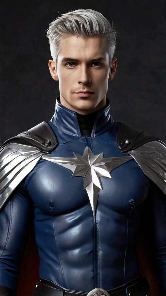 The American Revolution meets futuristic Sci-Fi. Hypermasculine, Caucasian male. Blacksmith, sword fighter. Tall, muscular, sinewy, strong, broad chest, wide shoulders and back, narrow waist. Handsome rugged face, strong brow and jaw, strong chin. Lapis blue eyes with thick silver eyebrows. Silver goatee on face, well trimmed. Medium length silver hair, wavy pompadour cut short on sides and back, tousled on top. Eight-pointed black star tattoo over the left eye. Black leather harness across his bare muscular chest, buckled on the right side. Large silver metal pauldrons and shoulder pads on both shoulders. Scarlet red tights/pants with white shooting star symbols down the sides of his thighs, stretched over muscular legs and a bulging groin. Black leather bucket boots, turned down at the knees. Black leather gloves, turned down at the elbows. A wide silver tech belt with black accents around his waist, meeting at a v-shape above his crotch. A short royal blue cape with a white shooting-star symbol, split down the back to resemble wings. He wields a huge silver electrified techno shortsword, electric voltage emitting from the blade. He also carries a techno shield, transparent and also electrified. full body pose.