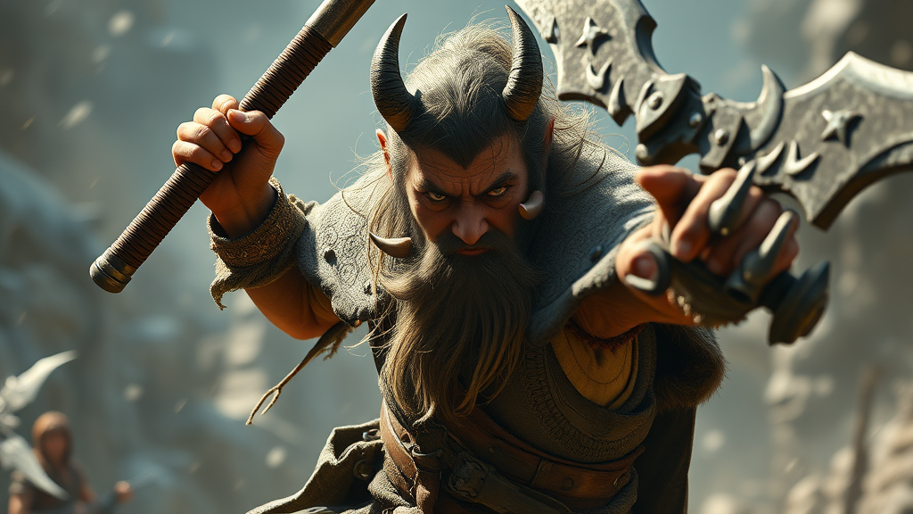 A full-length depiction of a male halfling, inspired by Pipin from Dragonlance, engaged in a fierce combat scene with a formidable adversary wielding a gigantic weapon. His expression is cunning and determined, with a detailed face and piercing eyes. The scene is a masterpiece of photorealism in 8k quality, influenced by the artistic styles of Jeremy Mann, Sandra Chevrier, and Maciej Kuciara. The composition is sharp, realistic, and 3D, with real shadows that enhance the dramatic effect. Imaginative elements include more than two arms, a rugged beard, and possibly horns, all contained within a fantastical setting. The halfling dons a unique outfit, distinct from typical clothing, emphasizing his role as a warrior in an intense battle.