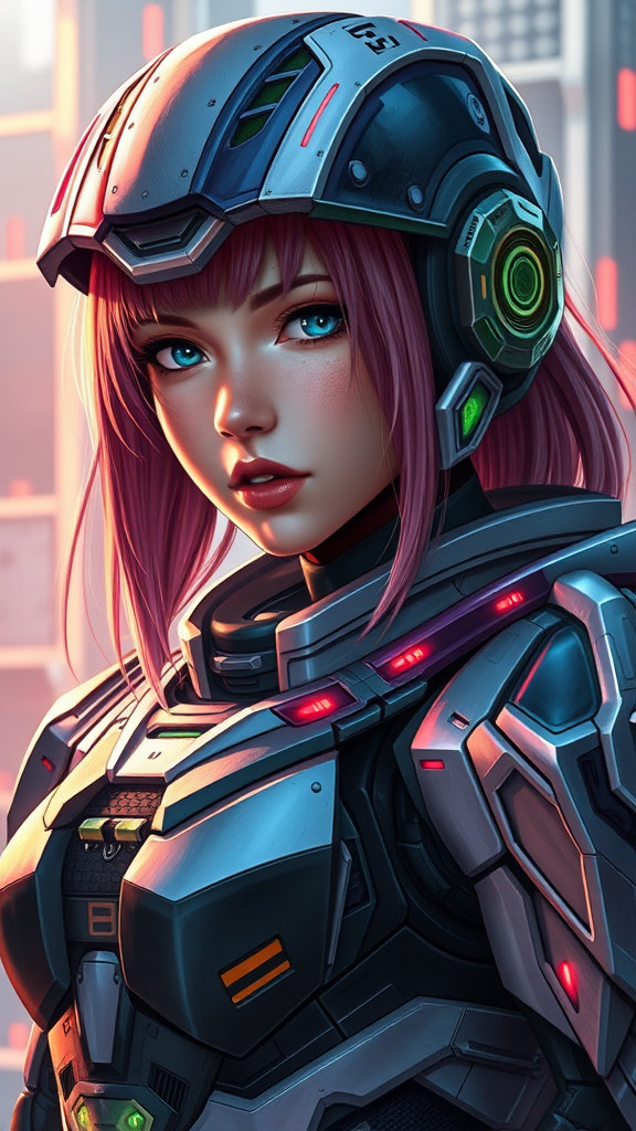 Photorealistic illustration, stunning portrait of Asuka Langley in futuristic sci-fi armor, intricate details, vibrant colors, striking expression, enhanced textures, dynamic lighting, cinematic aura, futuristic background elements, high-resolution, majestic presence, engaging and immersive composition.