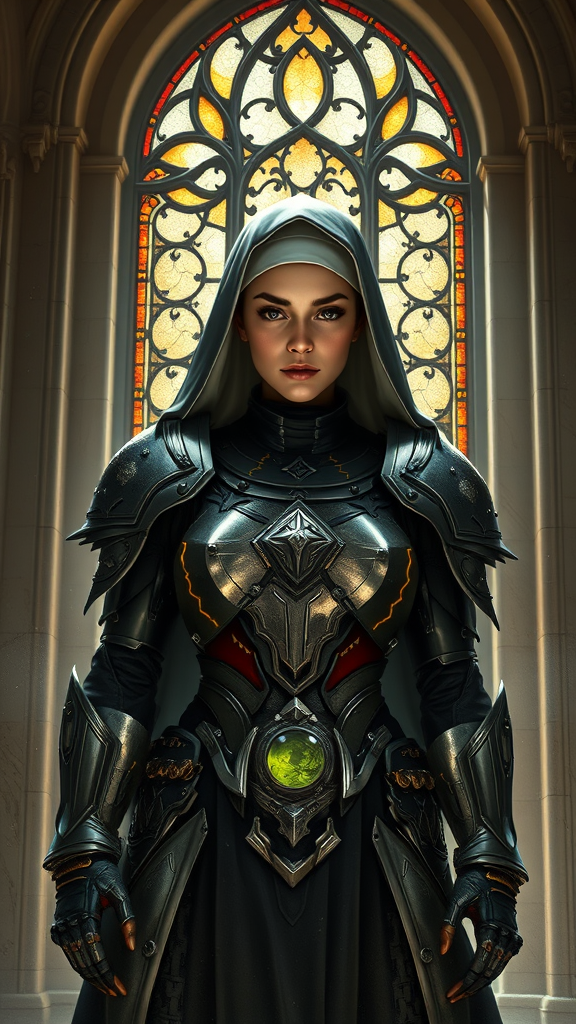 A full-body depiction of a devout Sister of Battle set within a dynamic action scene. She stands resolute before a stained glass window, exuding strength and grace. Her face is intricately symmetrical, with reflective eyes, dark eyebrows, and subtle makeup. Clad in sci-fi nun armor, she embodies the Warhammer 40k aesthetic. The scene is framed by marble walls, with dust particles illuminated by detailed, dramatic lighting, exhibiting techniques of chiaroscuro. The vantage is from above, with influences of professional impressionism oil painting techniques by artists like Waterhouse, John Constable, and Jeremy Mann. The ambiance blends the imaginative touch of Studio Ghibli with the expressive strokes of Greg Manchess, capturing a moment that trends on ArtStation and CGSociety. This depiction favors intricate detailing and dramatic intensity reflecting the influences of Makoto Shinkai and concept art spirit. Additionally, her steel and medieval armor is crafted with precision, avoiding any artistic anomalies such as mutations or blurring, ensuring the subject remains distinct and powerful.