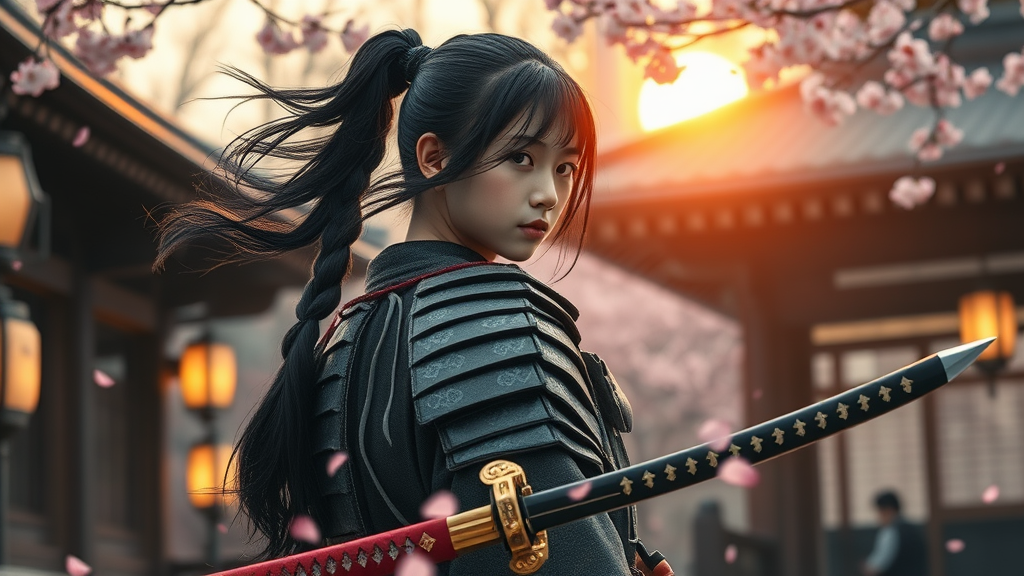 Detailed UHD Cinematic Lighting sharp focus intricate, Young Samurai with flowing black hair and a braid, clad in traditional samurai armor and holding a gleaming katana, poised within a serene Japanese temple, cherry blossom petals gently drifting in the breeze, softly lit by ornate lanterns, with a warm glowing sunrise infusing the scene with tranquility. Ethereal lighting captures the essence, rendered in high detail as a watercolor painting, invoking realism with ultra high resolution. Employing pastel colors, f3.5 lens, the artwork is a harmonious blend of muted tones and a refined watercolor palette, showcasing highly detailed digital artistry with physically-based rendering on textured paper.