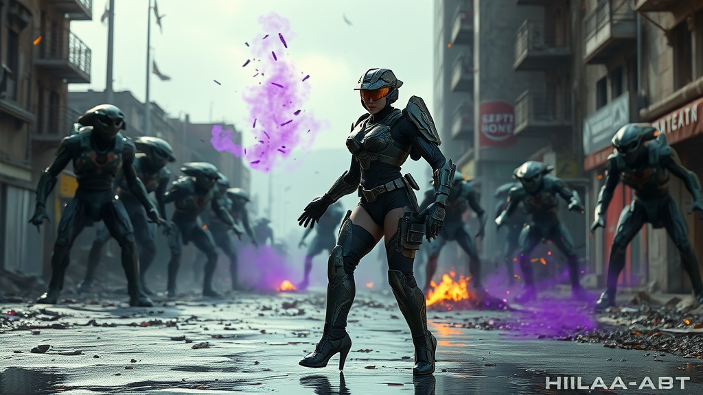 In a cinematic scene on a ruined Blade Runner-inspired city street, a bulk female warrior stands defiantly in elaborately detailed Halo Spartan armor, her perfectly toned body engaged in a dynamic epic action pose. With a surreal, almost anime-like intensity, her movements are accentuated by a vivid purple aura fire swirling around her, casting dramatic reflections on the ground. Flying debris fills the air as she fiercely battles an army of intricately designed aliens, each captured with extreme detail and photorealism. Her armor, rendered in stunning high-definition detail with octane precision, gleams under dramatic lighting, showcasing its intricate design. This epic and dramatic moment, a fusion of manga art style and hyper-realistic detail, is trending on ArtStation for its surreal energy and captivating imagery.