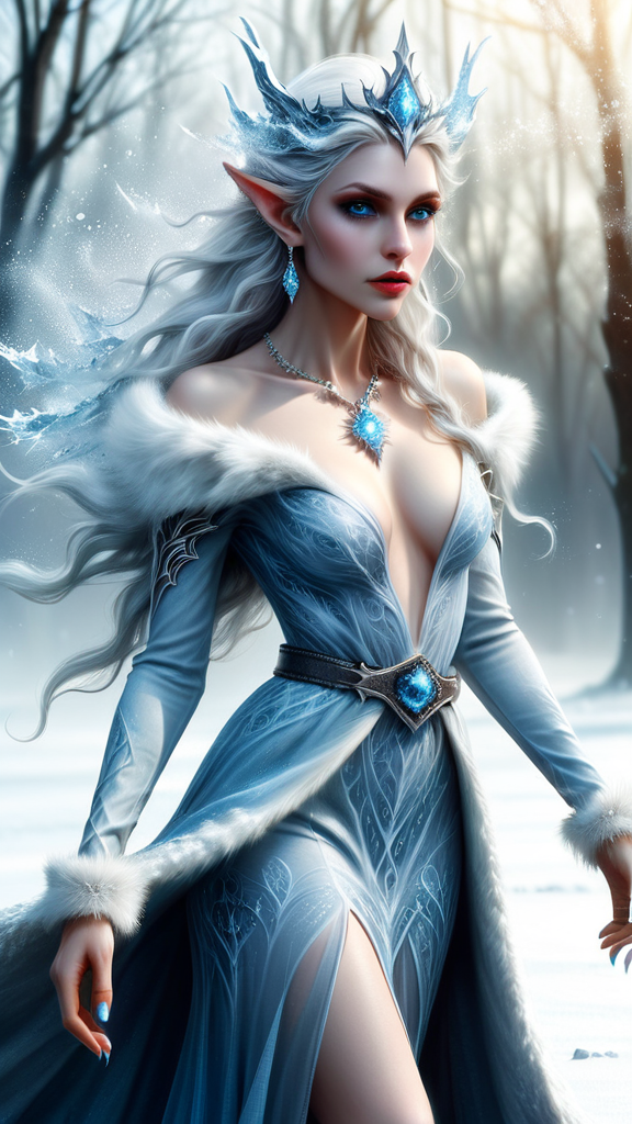 Supervillain. Myth and magic meets modern times. Elf/Fae, evil Queen. Ice elf. She dreams of a time when there were very few humans on Earth, an ice Age that may yet come to modern man. An ice covered landscape with barren trees and pale sunlight in a land of eternal winter. She has no love of humans and turns them into frozen statues through her magic. She is beautiful, but her beauty is COLD. She controls the weather, and it is always bitter cold in her presence. She can also use her magic to create glaciers or walls of ice, or manifest ice daggers from her hands to attack her enemies. Feminine female elf/fae. Tall, slender, statuesque. Her skin is pale white, white as snow. Long wild curly hair that falls down her back, platinum blonde. Long and sharp elf ears with silver dagger earrings. Model face with icy blue eyes that slightly glow, make-up in shades of blue. Her lips are blue but soft. A crown of clear icicles and ice crystals sits upon her royal head. She wears a silver necklace with a pendant that looks like a crystal snowflake. She wears a long sleeved gown, form-fitting with a plunging neckline. It is white and baby blue, the bottom half of the dress looks like shards of ice. She wears a fluffy white fur stole over her shoulders. Her belt is silver with a pale blue gemstone that glows. She wears a pair of metallic pale silver high-heeled boots. The soles and heels are sharp and keep her from slipping on the ice. Full body pose, wind is blowing and it is snowing.