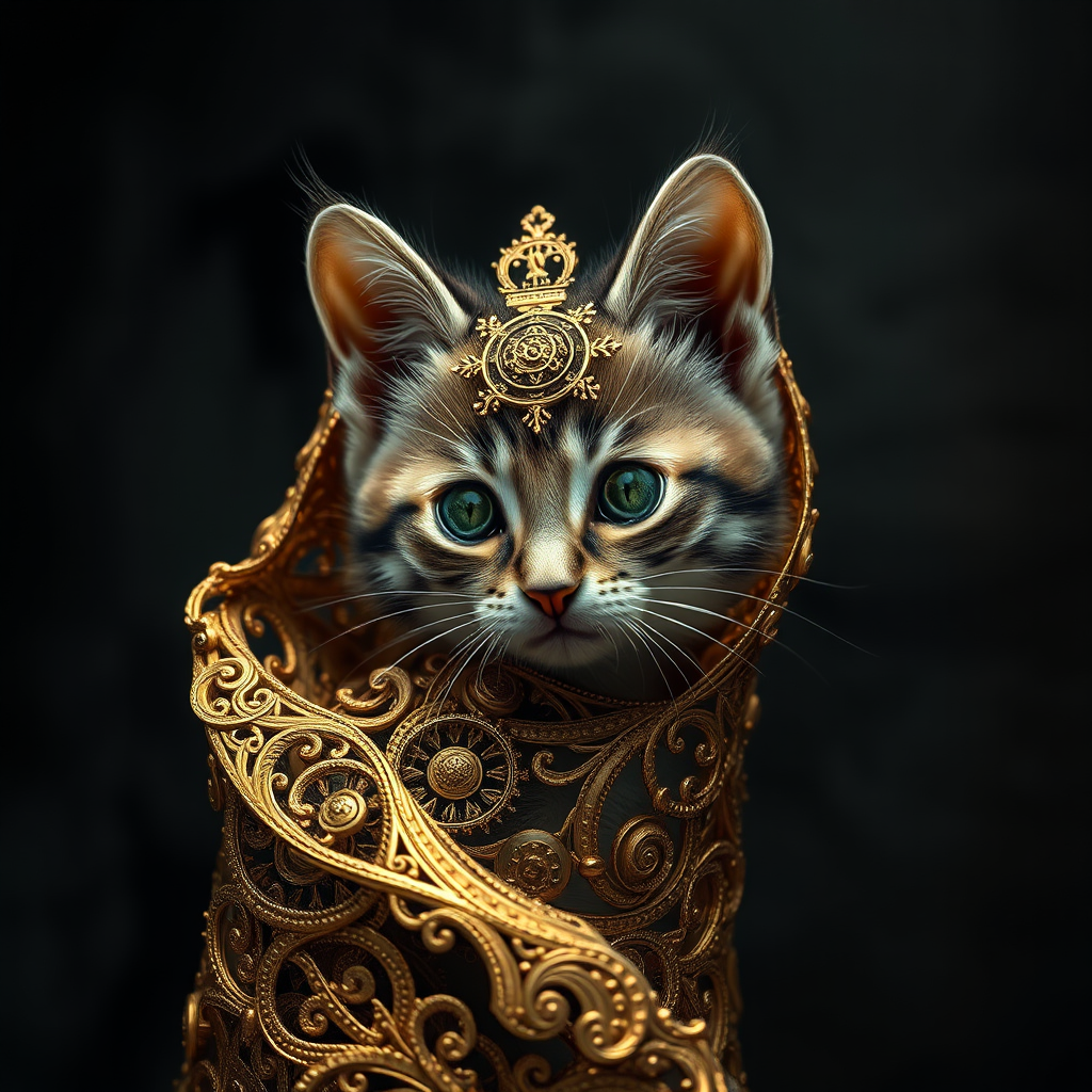 Kitten enveloped in intricate gold filigree, resembling a clockwork cat, set against a moody abstract dark background, featuring chiaroscuro lighting. Enhanced with high detail and photorealism, capturing hyper-realistic textures. Emphasizing a sense of motion and speed, presented in cinematic quality, employing long exposure techniques. Rendered in 8K ultra-high definition with superior resolution for maximum clarity. Aspect ratio maintained at 1:1 to focus on the striking composition.