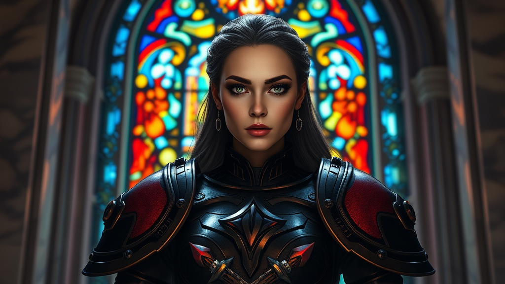 A majestic sister of battle stands in front of a vibrant stained glass window, her detailed armor reflecting the sci-fi essence of Warhammer 40k. Her symmetrical face, framed by dark eyebrows and subtle makeup, exudes determination. Reflective eyes reveal a story of battles won, enhanced by the dramatic chiaroscuro lighting that casts deep, moody shadows. The marble walls around her are illuminated by dust particles dancing in the detailed lighting. This scene, reminiscent of a professional oil painting with touches of impressionism, combines the influences of Waterhouse, Constable, Blinkey, Ghailan, Studio Ghibli, Jeremy Mann, Greg Manchess, and Antonio Moro. The composition holds the grandeur of trending art on platforms like ArtStation and CGSociety, capturing an intricate and high-detail moment. A second figure adds depth to the scene, both characters bathed in the ethereal glow from above. Despite its richness, the setting avoids disfigurement, maintaining graceful proportions and fine anatomy, akin to revered works of Makoto Shinkai Kyoto.