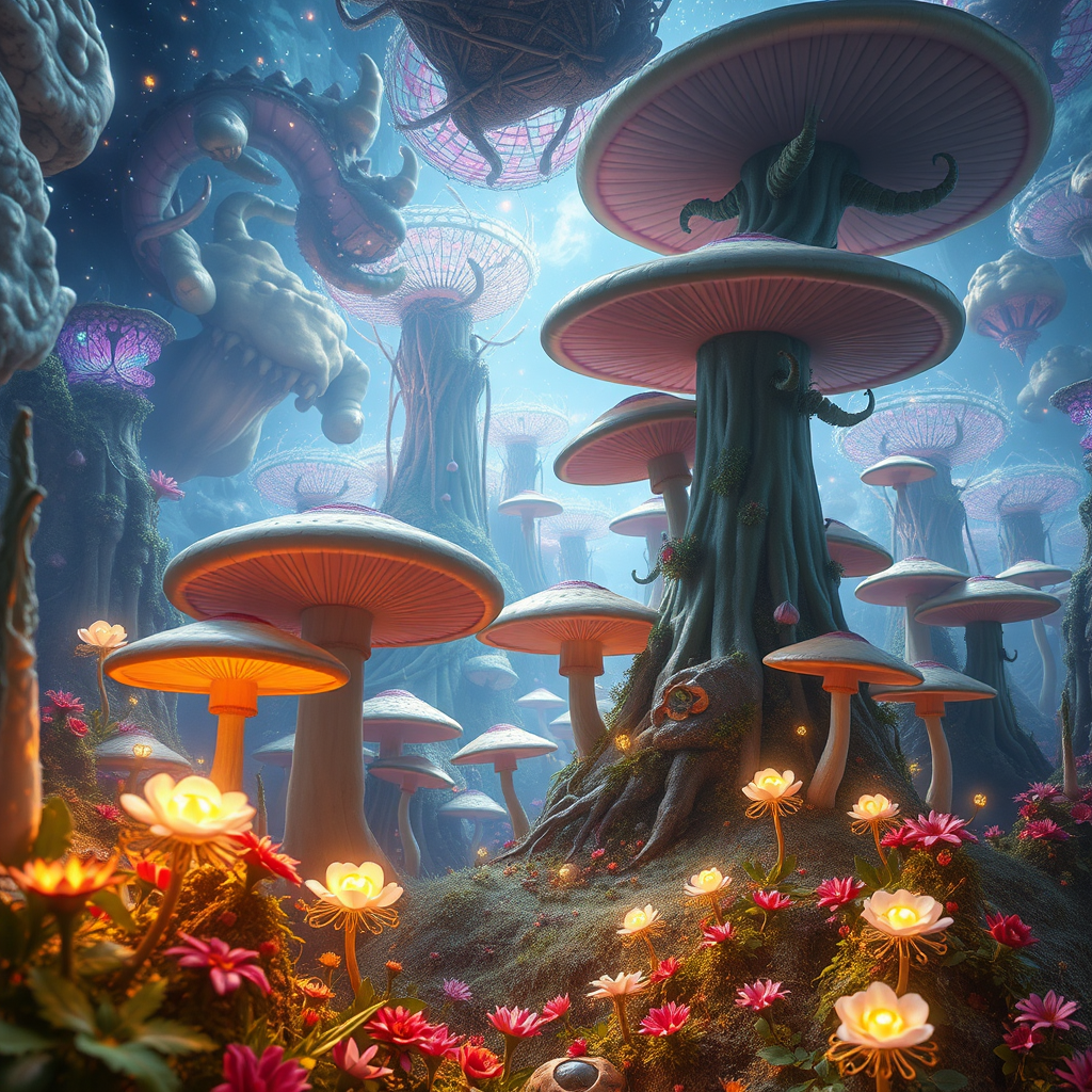 Dreamlike fantasy realm, stunning masterpiece, enchanting fairy woodland, ethereal glow, vibrant spectrum, towering mushroom flora, soft illumination, intricately detailed, unreal engine brilliance, inspired by Van Gogh, ultra-high-definition, high dynamic range, 16K resolution, immersive experience, abstract yet vivid, surreal artistry.