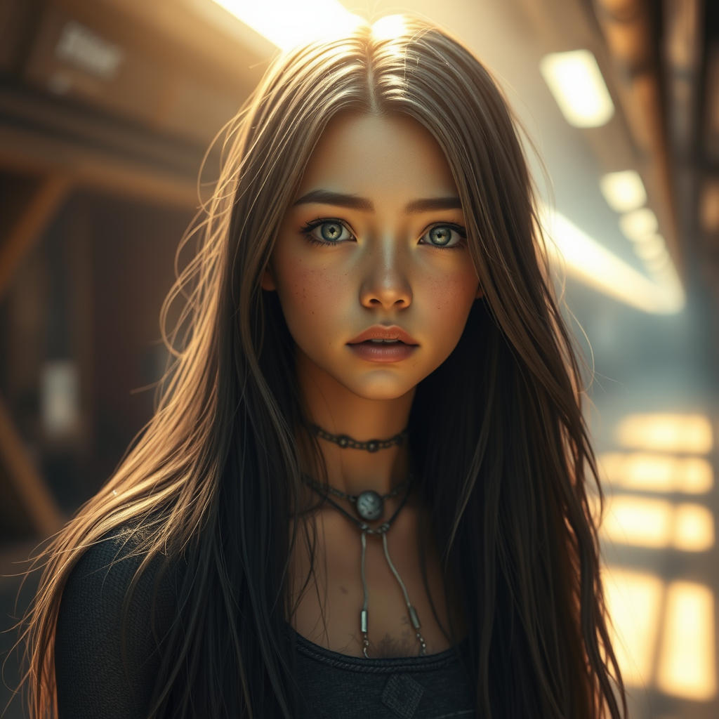Girl with long hair and gray eyes in flickering light, textured with super detail and hyperphotorealism, featuring a vast amount of fine detail. The setting is futuristic, captured in 8K UHD with super resolution, under warm cinematic lighting and natural textures. Beware of poorly drawn anatomy, including potential errors like wrong or missing limbs, floating or disconnected limbs, mutations, or unintended distortions that could appear ugly, blurry, or otherwise visually unappealing.