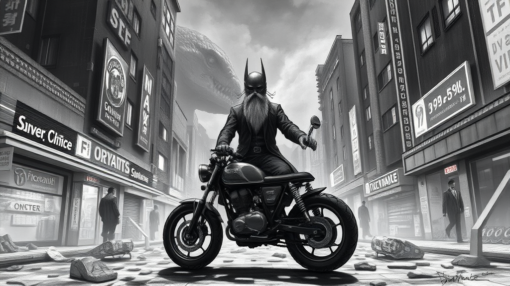 A mysterious figure stands alone, embodying the Occult, in an ojou-sama pose amidst a city under siege by giant monsters. This virtual reality world is becoming uncomfortably real, with a Shining Fragment of Ruins capturing the viewer's attention. Inspired by the style of Vincent Joyal, the scene incorporates elements from a supermarket and a farmhouse interior, blending them seamlessly into the fabric of the city landscape. The artwork draws influence from the early 1920s, featuring two distinct faces and personas merging into a single concept. The draft is painted with finesse, showcasing a striking composition: a motorbiker on an ironman-like motorbike, with accentuated features such as a big head, shoe laces, and pointed footwear. The surreal imagery includes two navels, a long beard, and blurred elements, suggesting a reality on the brink of mutation. Each component—the fused fingers, broken legs, and shimmering black-and-white aesthetic—creates a sense of unnatural anatomy, further distorted and exaggerated with liquid and disfigured forms. The piece employs a sepia-toned, cartoonish style with low resolution, emphasizing errors and vanishing limbs, adding eerie undertones to this analog-inspired artwork.