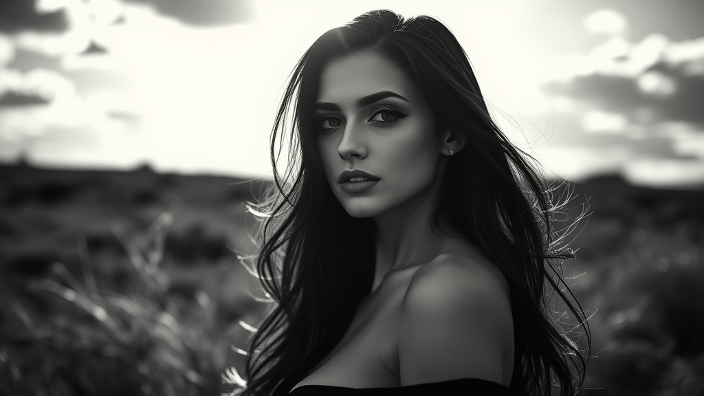 A stunning black and white fashion editorial portrait featuring a captivating dark-haired woman immersed in a natural setting with a dramatic sky. The play of light and shadows creates a mesmerizing effect, captured in high-resolution for a realistic and professional photographic finish. The cinematic angle highlights the woman's elegance while dynamic backlighting adds depth and intrigue to the scene, enhancing the overall mood and composition.