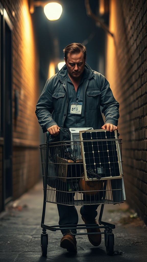 A striking photograph captures an unexpected moment as renowned tech innovator Elon Musk navigates a shadowy alleyway dressed in tattered apparel, pushing a weathered shopping cart brimming with used electronic components and damaged solar panels. This candid scene features Musk in disguise, seemingly immersed in the life of a street dweller, starkly contrasting his public persona as a billionaire visionary. The scene is illuminated by the dim glow of an overhead streetlight, casting a raw and gritty atmosphere, while the softly blurred background further emphasizes the natural spontaneity of the capture. The photograph zeroes in on Musk's posture, with shoulders hunched and gaze downward, evoking a sense of vulnerability and introspection. This compelling image invites viewers to ponder the fragile line between wealth and misfortune and to consider the realities faced by the homeless community, detailed in hyper-realistic, ultra-high definition resolution, capturing every nuance in vibrant detail.