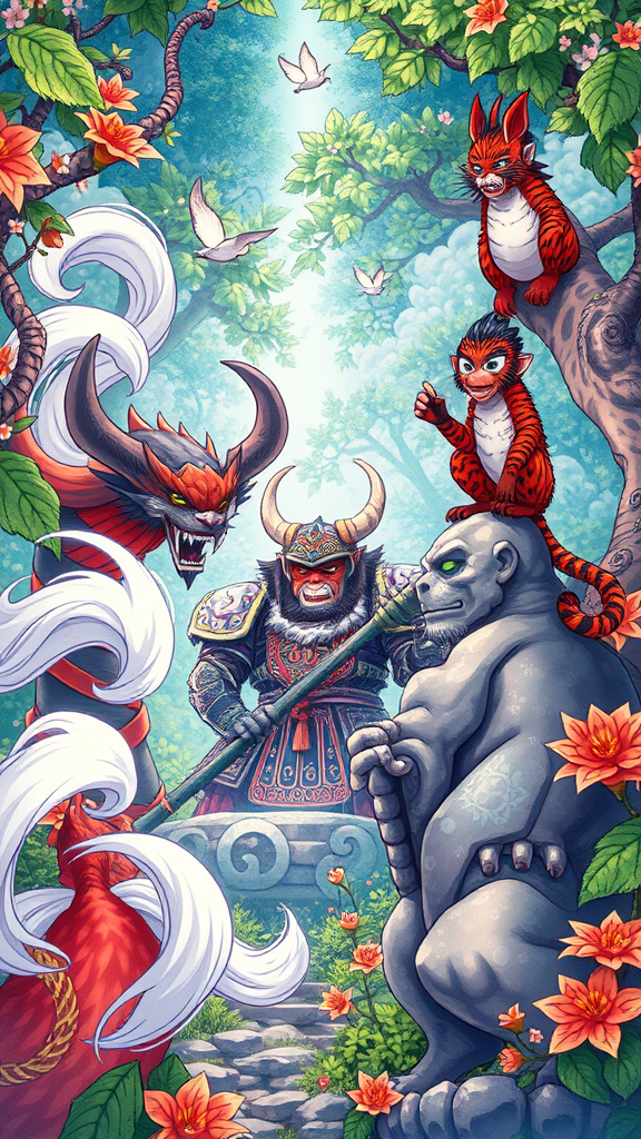 A vibrant and intricate illustration showcasing a mystical scene featuring a kitsuné with flowing white tails and glowing eyes, an imposing Oni wielding a massive club and adorned with traditional armor, a Nué with a tiger's body and a monkey's face perched ominously, and a Tengu with bright red skin and elongated nose perched majestically on a rock. All characters are enveloped in a lush, enchanting forest setting, dotted with intricate funji decor adding a whimsical touch. The style is reminiscent of detailed anime, with bold lines and a high-definition 2K resolution that captures every nuance of the scene, from the glistening leaves to the delicate patterns on the characters' attire. The atmosphere exudes a magical, otherworldly aura, with small, playful variations and creative details that preserve the essence of the original concept while adding a fresh twist.