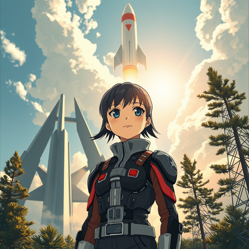 Young girl in a futuristic sci-fi suit stands proudly in front of a towering rocket, reminiscent of a classic Soviet-era poster. Her eyes sparkle with determination against the backdrop of a sleek spaceship ascending towards the sky. The sunny atmosphere casts natural lighting on the scene, highlighting the intricate details and dark color palette. The artwork brings together the dynamic styles of anime and manga graphics, rendered in high definition with an offset printing technique. The design captures the essence of optimism and adventure, in a harmonious blend of retro and futuristic elements, maintaining a vibrant CMYK color scheme.