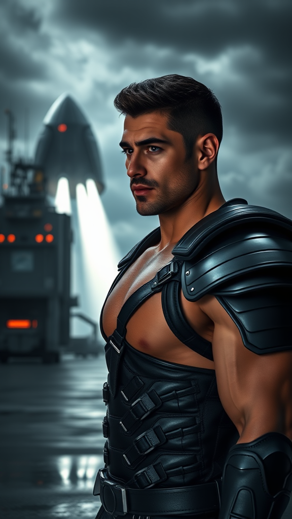 Ultrarealistic full-body portrait photograph depicting a 28-year-old dominant Israeli Caucasian male, showcasing a perfectly sculpted, muscular physique with a hairy chest, smaller proportioned head, and glossy, shiny hair. Captured with a Hasselblad X1D - 50c in vibrant 8K Ultra-HD, the image features cinematic and moody lighting, rendered in hyper-realistic detail. The scene is set at a spaceport, against the dramatic backdrop of a sci-fi ship launching into an overcast sky. The subject is clad in intricately detailed plate leather armor, reflecting a futuristic warrior aesthetic reminiscent of 'Pursuit' by Gesaffelstein. The action-packed pose suggests motion, accentuated by volumetric lighting and a natural blur effect, creating an epic, movie-like ambiance. The attention to natural textures and light enhances the photorealism, while advanced rendering techniques such as ray tracing ensure the highest quality and detail. The overall composition evokes a sense of power and elegance, integrating elements of sci-fi and realism seamlessly into the scene.