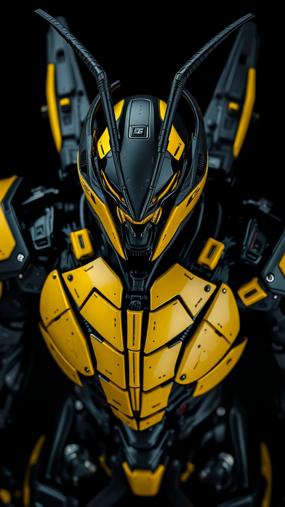 A black and yellow battle mech with intricate detailing and a striking sci-fi mask, featuring reflective yellow body panels and a sleek jetpack. This insectoid-inspired combat mech boasts an array of fine details and distinctive bright yellow polymer armor elements with unique identifying marks. The inner components feature natural textures and reflections, set against a dramatic black background that enhances its eerie and intimidating presence. Captured from a top-down view with dramatic staging, this mech is portrayed in stunning quality with ultra high shutter speed for a cinematic feel. The image is in ultra high resolution, achieving a hyper-realistic, photorealistic look in 8k UHD with Rembrandt lighting.