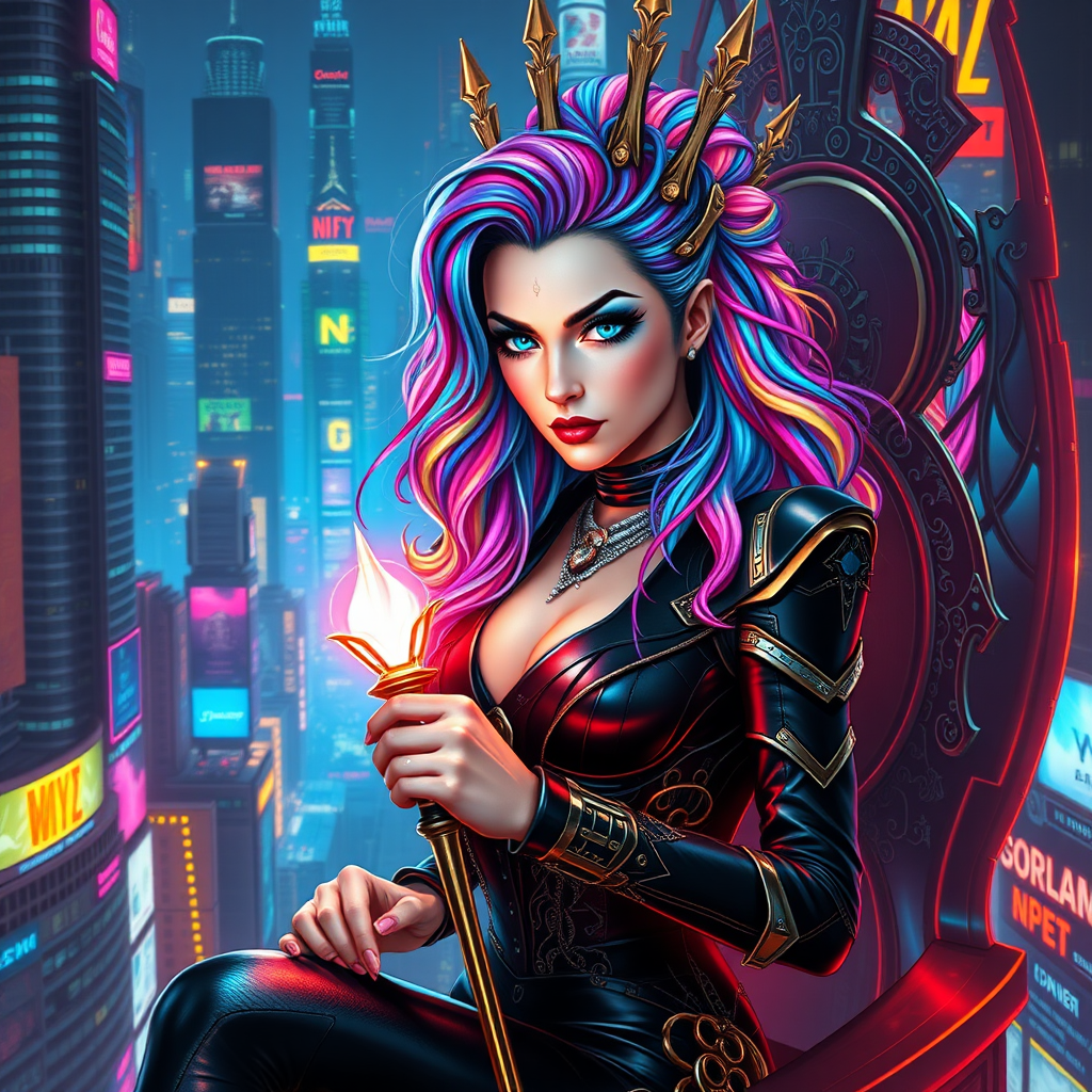 In a sprawling metropolis of towering skyscrapers and vibrant holographic advertisements, the cyberpunk fantasy queen reigns supreme from her neon throne. Her electric blue eyes, intensified by advanced cybernetic enhancements, survey her domain with a gaze both intimidating and mesmerizing. Her cascading hair is a dazzling kaleidoscope of colors, constantly shifting in harmony with the pulsating neon lights. Clad in a sleek, midnight-black suit woven with metallic threads and intricate circuitry, she exudes an aura of both elegance and power. In her hand, she wields a luminous scepter that pulses with energy. Her dominion over the city is uncontested, as fear and admiration intermingle in the hearts of all who behold her, a ruler as commanding as she is enigmatic in this futuristic realm of technology and light.