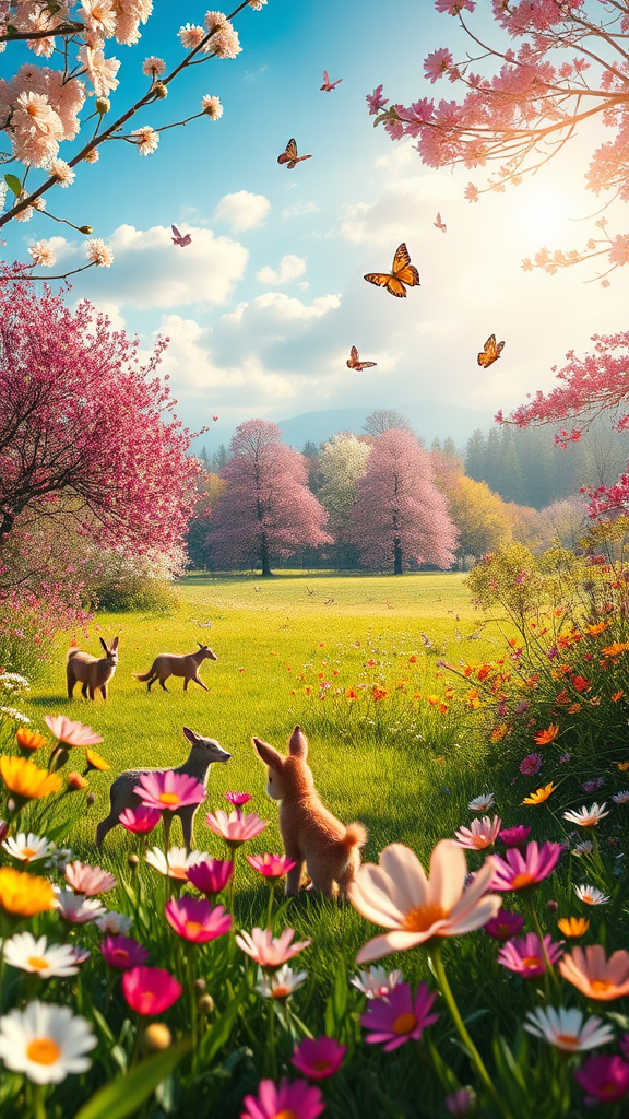 A serene landscape filled with the vibrant colors of spring, where flowers bloom in abundance and gentle sunlight bathes the scenery. A joyous atmosphere surrounds a peaceful meadow dotted with playful animals and fluttering butterflies, embodying the essence of rejuvenation and happiness.