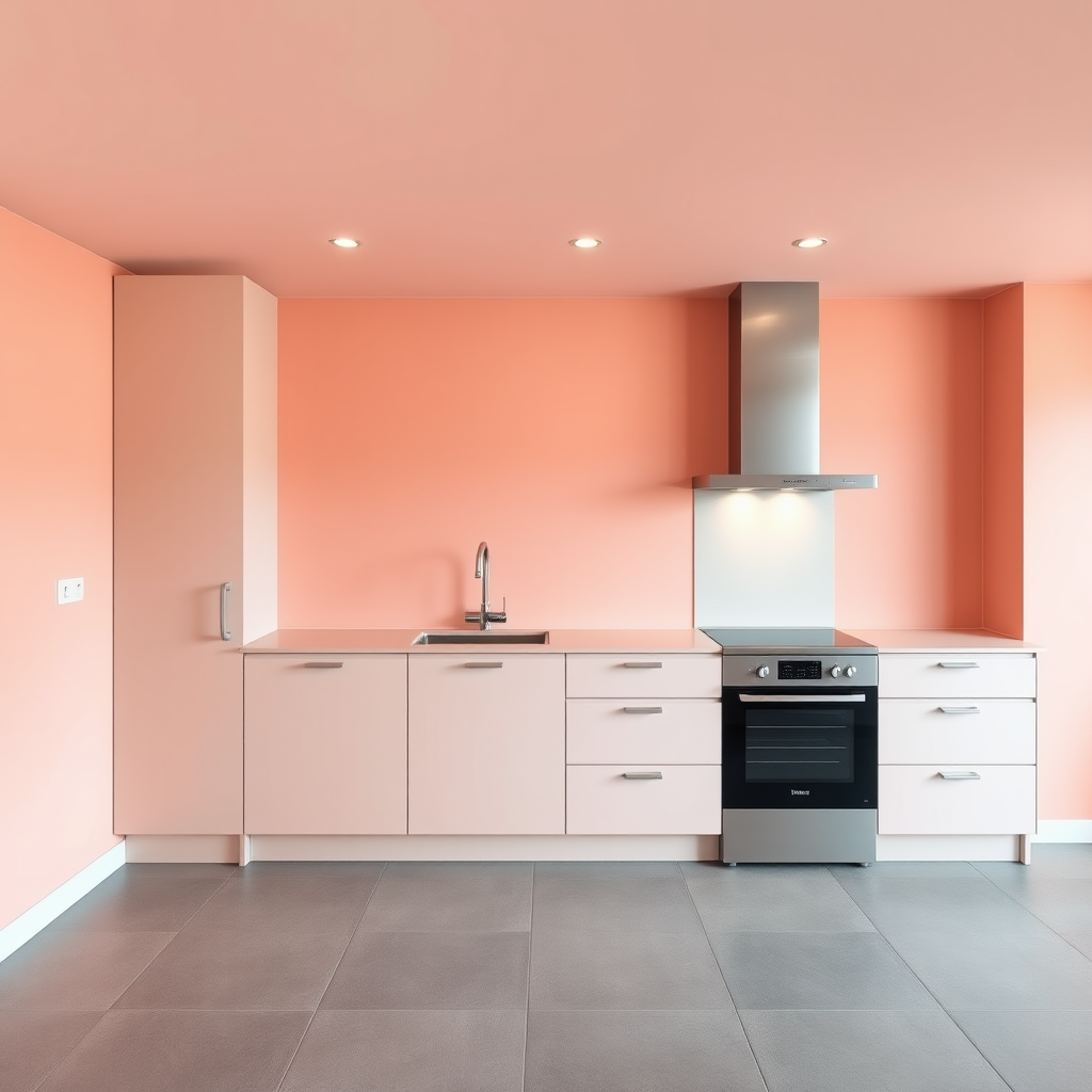 A minimalist kitchen with a sleek, matte coral finish is complemented by a modern silver faucet and high-end appliances that maintain a streamlined aesthetic. The flooring features matte warm grey tiles, introducing a subtle texture and cool undertones to the room. Recessed ceiling lights provide a soft, even glow across the kitchen, accentuating its smooth surfaces and clean lines. The simple ceiling enhances the sense of space, creating a refined and contemporary atmosphere. UHD --ar 9:16.