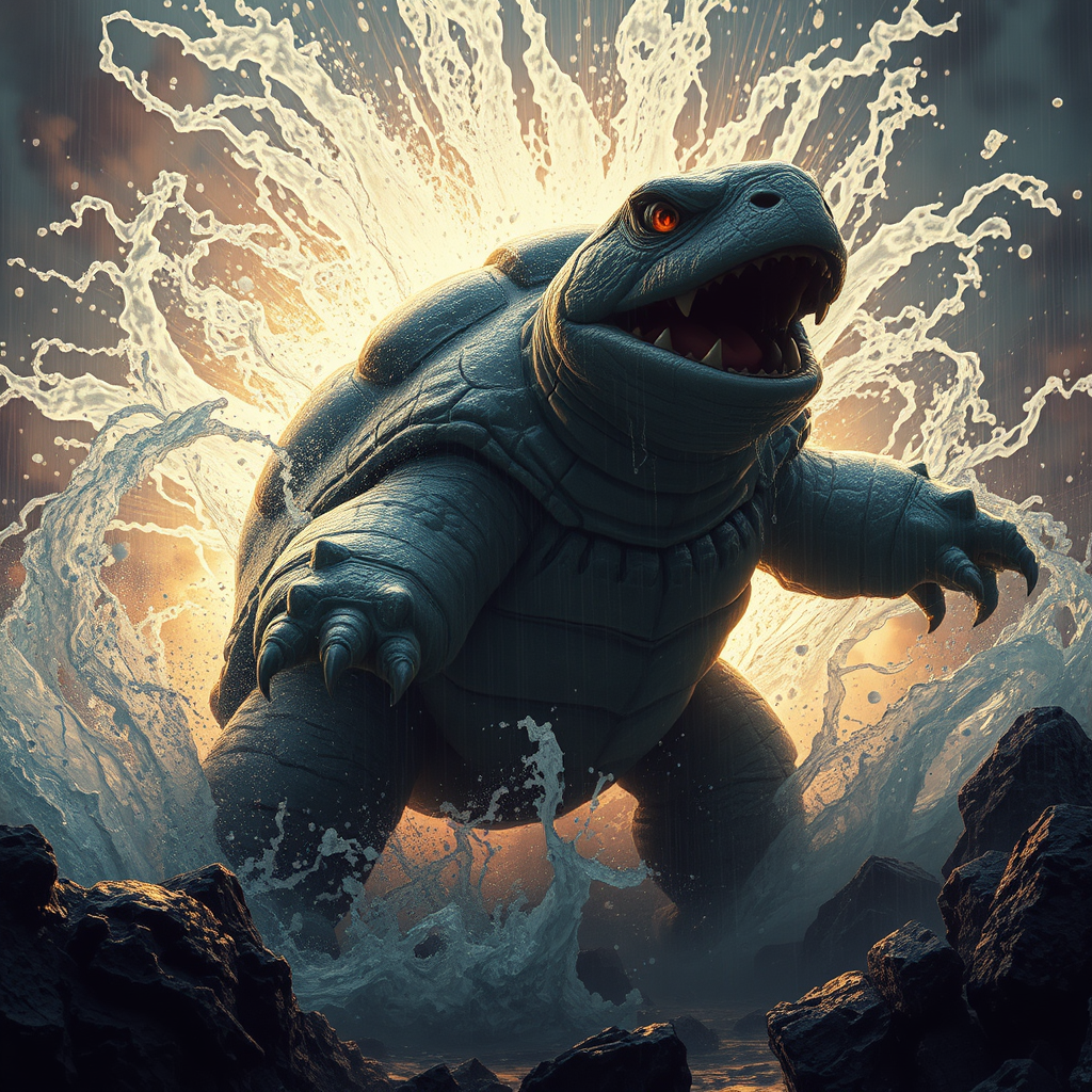 Charging dark Pokémon Blastoise, an enormous and menacing monster turtle, unleashing a torrent of water with explosive force, every drop captured in intense, wet detail. The scene is dense and twisted, evoking a sense of macabre horror through its intricate design and elaborate textures. Bathed in dramatic lighting, the composition achieves hyperrealism with photorealistic quality, as if part of a gripping cinematic experience, rendered in stunning 8k clarity, portrayed in a tall and imposing 9:16 aspect ratio.