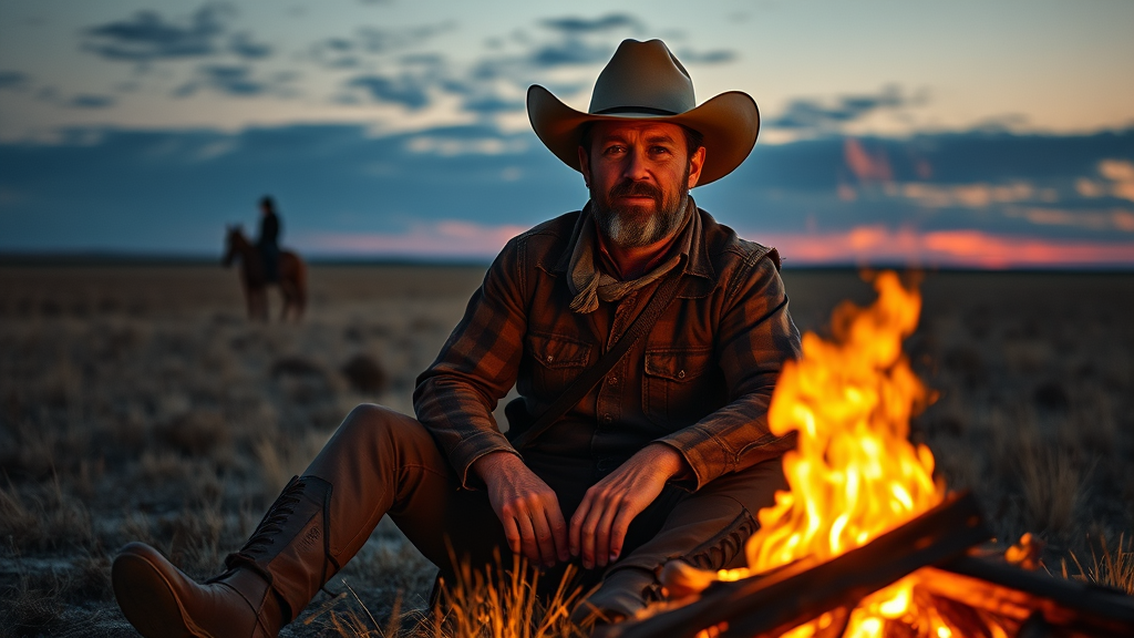 A breathtakingly detailed portrait of a 28-year-old cowboy sitting by a campfire on the vast prairie at twilight, capturing the essence of the western frontier with cinematic beauty. The scene is ultra-sharp, with the cowboy's rugged features highlighted by the flickering firelight, and the expansive landscape stretching into the horizon. His attire is authentic, complementing his sturdy build and the resilient spirit of the borderlands. The background subtly hints at the presence of a lone female silhouette, adding depth to the composition without overshadowing the cowboy. This image is free from digital imperfections, showcasing impeccable proportions and lifelike clarity. It exudes a sense of solitude and adventure, with attention to every intricate detail.