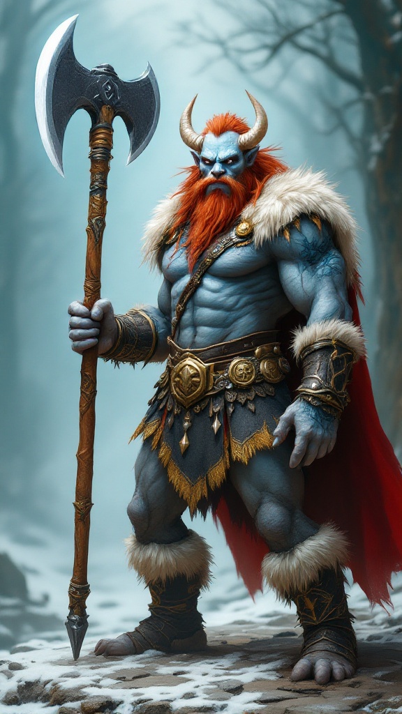 From the realm of faeries and fantasy. A handsome troll with pale blue skin (((blue skin))) Warrior. He wields a giant Viking war axe. Tall, strong, big muscles, muscular, sinewy, broad chested, wide back, narrow waist, bodybuilder. Short fiery red hair, mullet with middle-parted bangs. White steer horns curved upwards from the front of his temples. Handsome masculine rugged face, Icy blue eyes, strong brow and jaw. Dark red goatee, neatly trimmed. Golden pauldrons trimmed with black on broad shoulders. Black leather bondage harness on his bare chest, dark blue tribal tattoos on his chest. Black leather bracers on strong arms. White fur loincloth covering his girth, exposing strong muscular legs, a golden Viking styled belt trimmed with black around his waist. Knee-high black leather boots with white fur tops. A Scarlet-red short cape with golden-yellow Viking designed trim around the edges. Full body pose, axe raised in warrior stance. {{MASTERPIECE}}