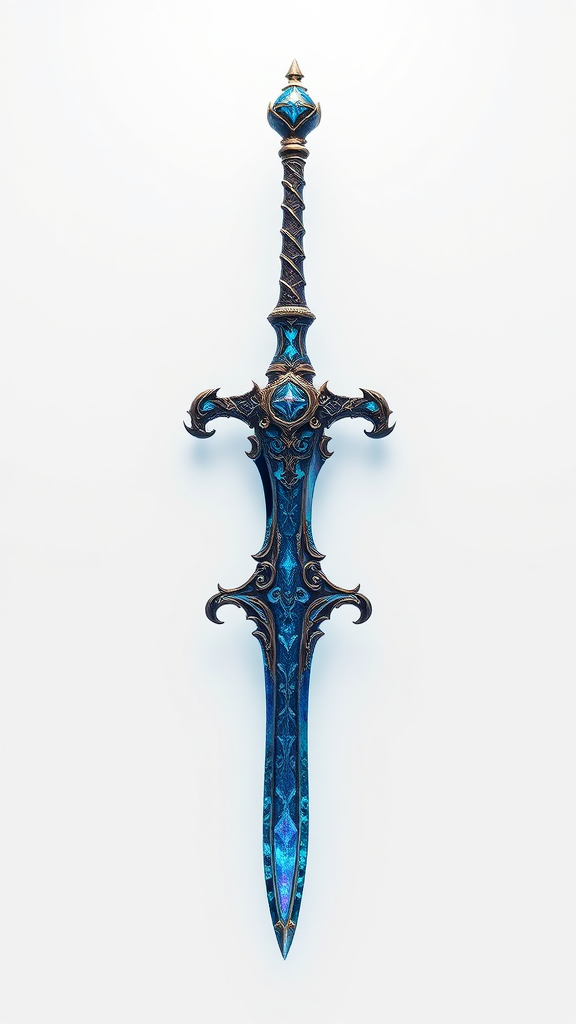 A breathtaking enchanted sword as a video game asset, rendered in a detailed fantasy illustration style, showcasing intricate craftsmanship with an iridescent finish. The sword emits a captivating blue glow, enhanced by beautiful lighting that highlights its extreme detail. The scene is rendered with high samples, utilizing octane rendering techniques. Set against a pristine white background, the sword stands isolated, its majestic presence captivating and trending on art platforms.