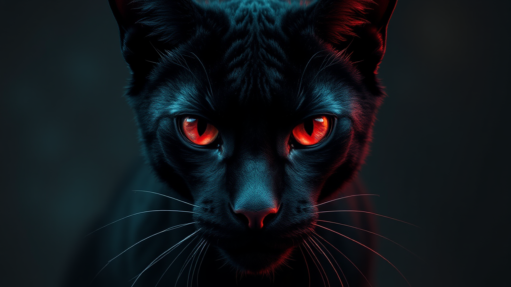 Black feline portrait in junglecore style, exuding haunting imagery with the influence of Jan Matejko and Miyamoto Musashi. Featuring striking dark teal and light red hues, the piece captures a raw, skeletal character, blending elegance with mystery in a 2:3 aspect ratio, conveying an air of mystique and intrigue.