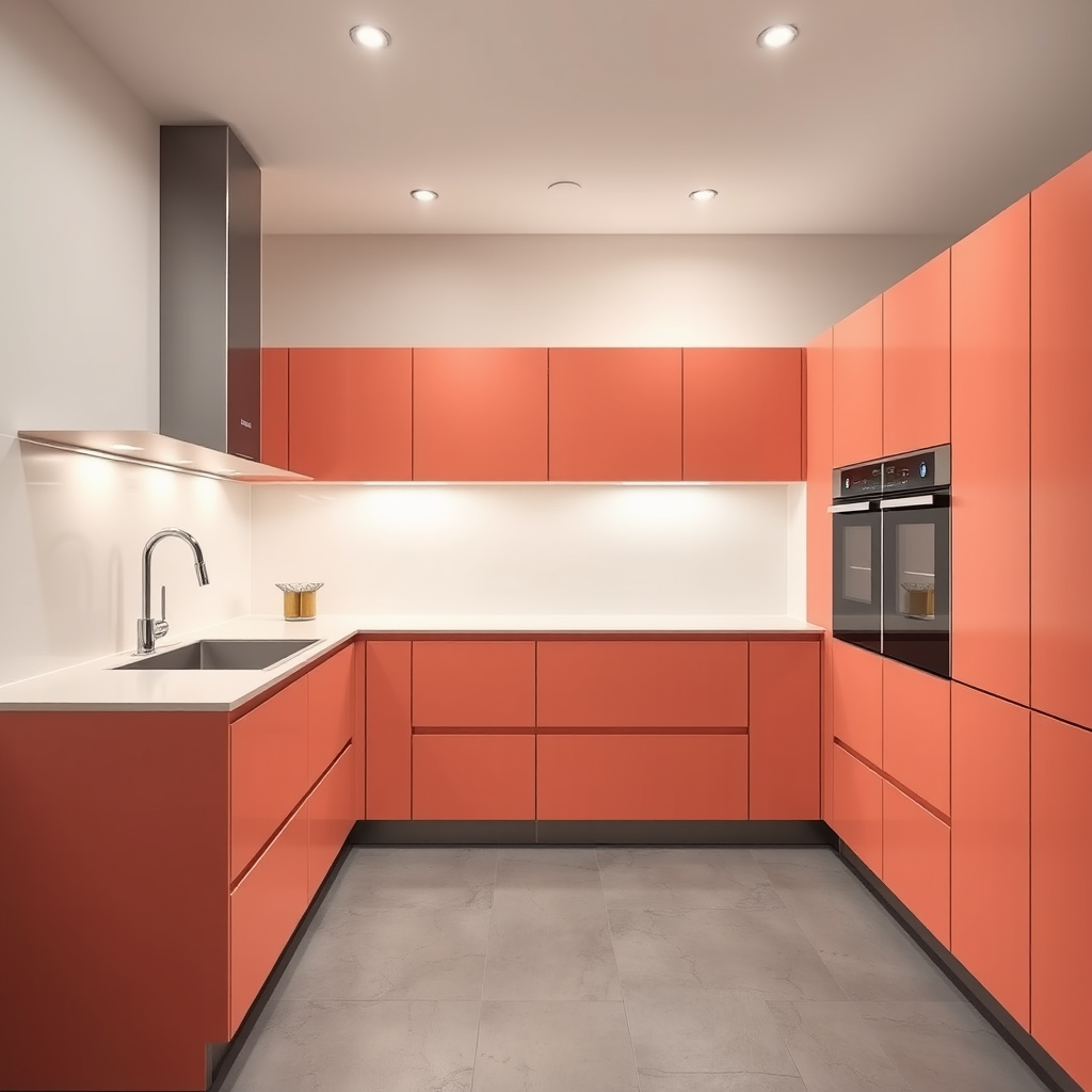 Photography of a minimalist kitchen with a sleek matte coral finish, featuring a clean, modern silver faucet and integrated high-end appliances that maintain a streamlined look. The flooring is a matte warm grey tile, adding a cool texture to the space. Recessed lighting in the simple ceiling casts a soft, even light across the kitchen, highlighting the smooth surfaces and clean lines, captured in UHD with an aspect ratio of 9:16.