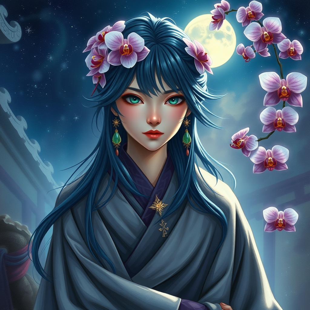 A mysterious sorcerer from the Tang dynasty with emerald green eyes, midnight blue hair adorned with an orchid hair accessory and a celestial star ornament, stands within an ancient temple under the midnight sky. The sorcerer is draped in flowing robes, exuding an ethereal presence. A jade charm hangs elegantly from their side. The surroundings are a mystical landscape, bathed in a light that shines like a thousand constellations, casting an otherworldly glow. Orchid blossoms drift through the air like magical sparks, enhancing the dreamlike scene. Emulating the style of Kay Nielsen, this wide-angle portrait captures the sorcerer's gaze directly, enveloped in mystical lighting. The mixed media rendering blends vivid colors and expressive detailing to create a narrative of enchantment and timeless allure.