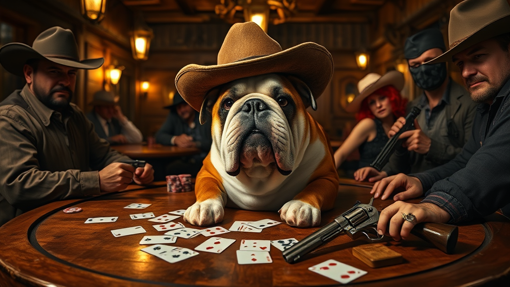 A vivid portrait captures an English bulldog deeply engrossed in a poker game inside a classic western saloon, the rustic wooden interior dimly lit by flickering lanterns. The bulldog sports a well-worn cowboy hat tilted jauntily to one side, its expression a mix of concentration and mischievousness. Scattered across the table are playing cards and poker chips, while a pair of gleaming revolvers rest within reach, adding to the tense atmosphere. Other players, a lively mix of colorful characters including a rugged cowboy, a flamboyant showgirl, and a brooding gunslinger, are caught in frozen action around the circular table. The scene is captured with the exceptional clarity and detail of an 8k uhd RAW photo, as if taken with a high-quality Fujifilm XT3 DSLR, enhancing every texture from the bulldog's wrinkled brow to the worn texture of the saloon's hardwood floors. The mood is both playful and dramatic, perfectly encapsulating the timeless intrigue of the Wild West.