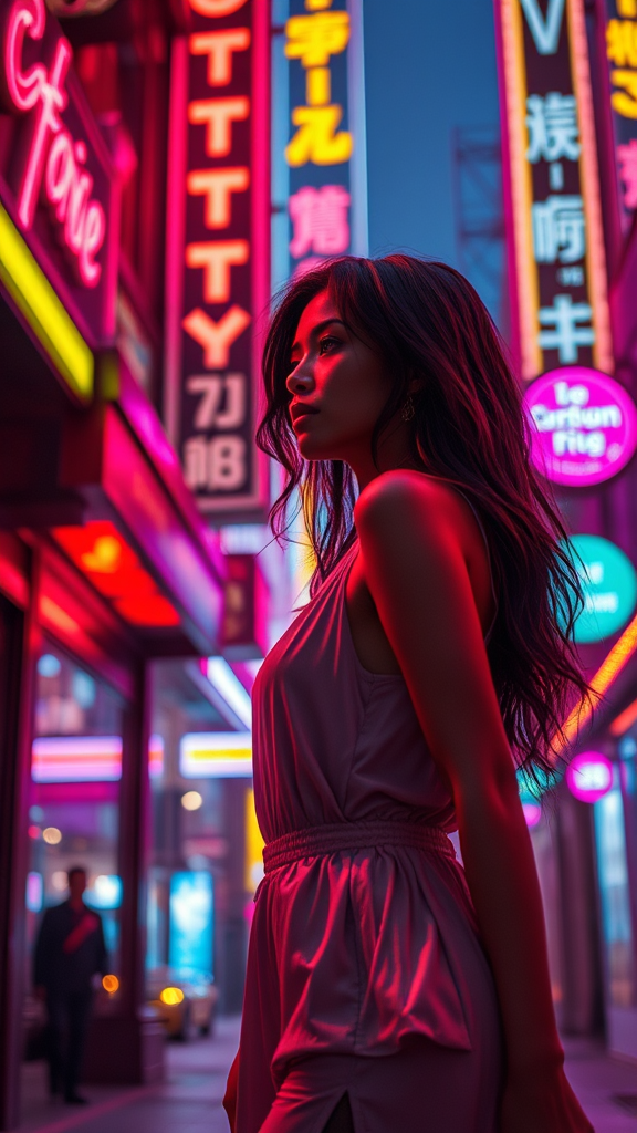 A breathtaking cinematic portrait of a woman poised on a bustling Cyberpunk City street, surrounded by the futuristic allure of Cyberpunk 2077. Vibrant neon signs cast colorful reflections, while cool neon lights dance off her silhouette. A synthwave ambience envelops the scene, complemented by a beautifully blurred bokeh background, enhancing the captivating mood of this urban sci-fi landscape.