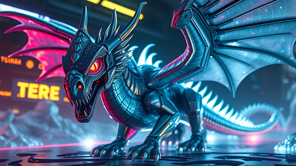 A hyper-detailed metal dragon with futuristic style dominates the sci-fi environment, its fury eyes gleaming with intensity. Its full body is sculpted in a realistic manner, showcasing ice and metal effect wings that shimmer brilliantly. Neon lights cast vibrant reflections across its sleek scales, while laser-like energies pulse along its contours. The scene is rendered in stunning 4k super resolution, capturing every intricate detail of the dragon's design and the surrounding sci-fi atmosphere, presented in an impressive 9:16 aspect ratio.