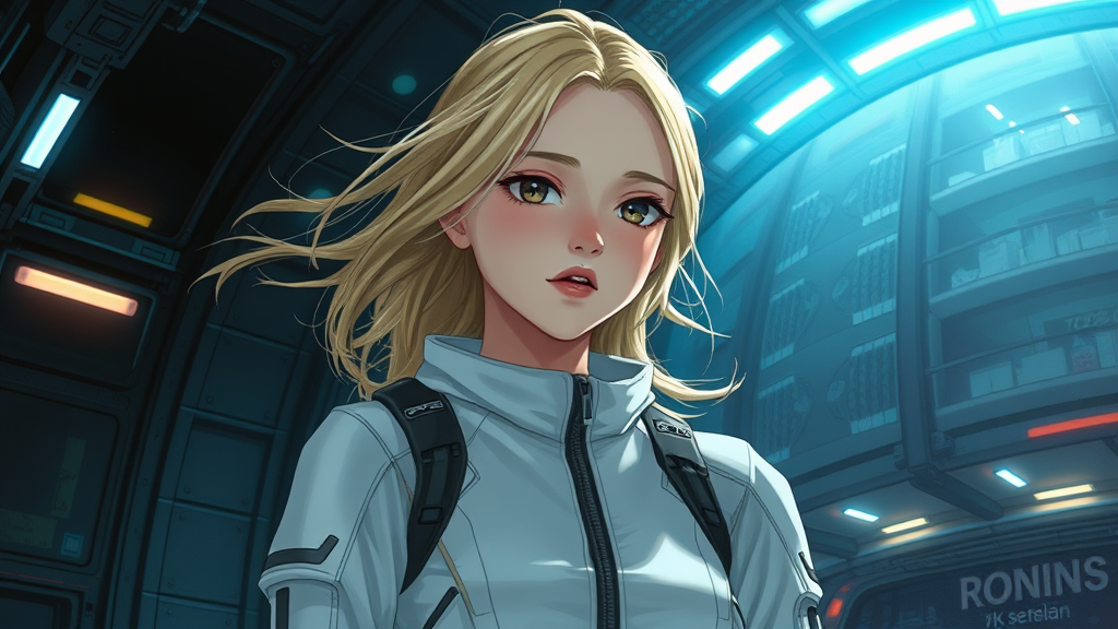 Anime-inspired art in the style of Tsutomu Nihei, depicting a young girl in a sleek white sci-fi jumpsuit. Set in a cyberpunk world, she has loose, long natural blonde hair against a dramatically dark background inside a futuristic spaceship. Her beautiful facial features convey a cold, detached expression, with her hair fluttering in the air of the gloomy, chilly room. The scene is rich in anime and manga graphics, showcasing gigantism, muted colors, and punctuated by a luminous blue glow contrasted by a bright light from one side. The environment is filled with intricate small details, sharp angles, and sprawling multi-storey structures, casting deep shadows and blurring the distant background. The atmosphere is steeped in futuristic sci-fi, marked by hyper-detail, clumps of energy, and sudden flashes of light, portrayed from a third-person perspective, emphasizing a portrait composition.